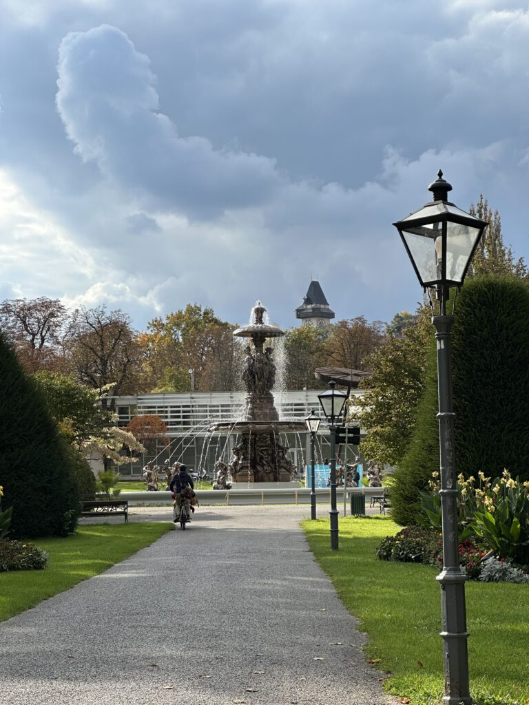 Vom Brunnen im Grazer Stadtpark bietet sich ein malerischer Ausblick auf den Uhrturm. Majestätisch erhebt sich der Schlossberg hinter dem Brunnen, und der Uhrturm ragt eindrucksvoll darüber hinaus. Da der Stadtpark direkt an den Schlossberg grenzt, lässt sich ein Spaziergang dorthin wunderbar mit einem Besuch des Uhrturms verbinden – ein Abstecher, der sich auf jeden Fall lohnt!